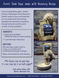Here is the “recipe” Vondelle McLaughlin, Washington Ferret Rescue & Shelter, Shelter Director is using to save sick ferrets – these are ones that are not eating, have been having hypoglycemic episodes, are getting through and post coccidia, and a number of other problems we deal with at the shelter.
