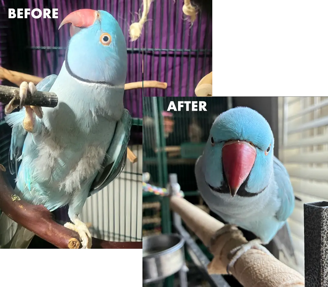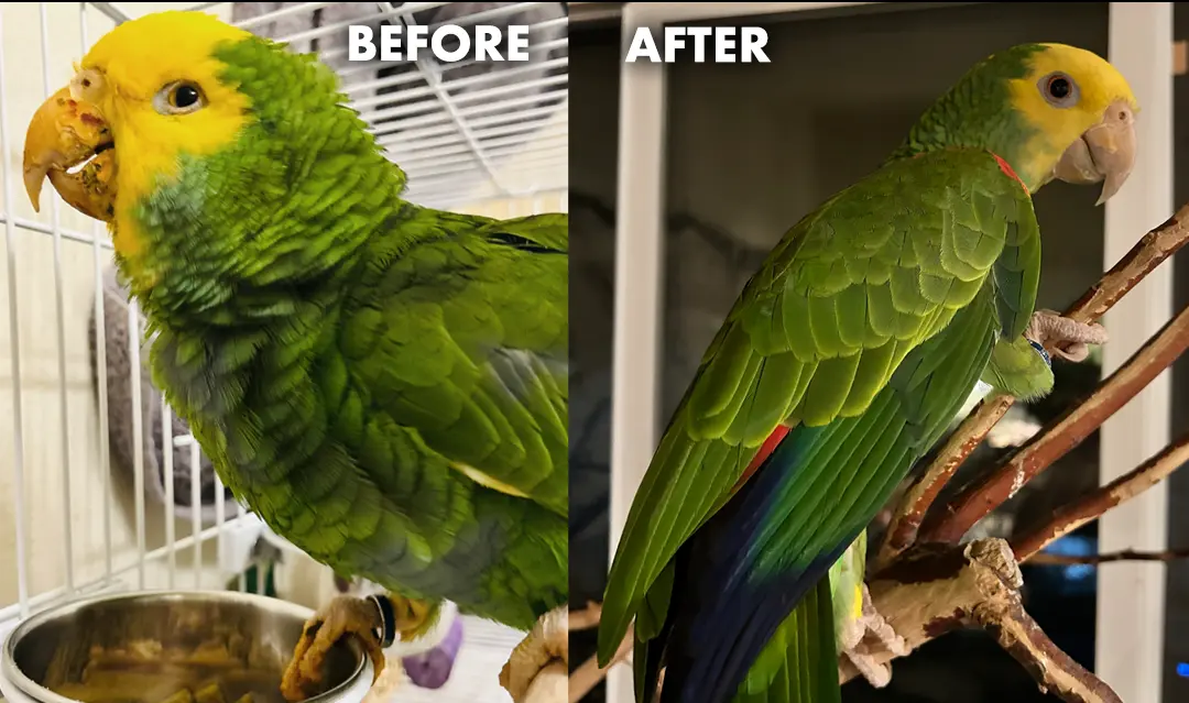 “Buddy before and after. She was featherless and bleeding. It took me a week to transition her from sunflower seeds to Harrison’s High Potency Fine. She now eats Harrison’s nuggets and flies around my house. I rescued her on March 11,2018 and she’s a VERY happy bird. She’s the love of my life.”
